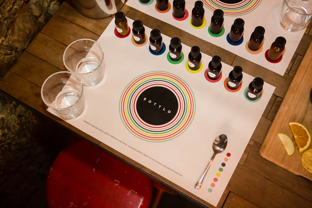 The media tasting experience played on the idea of 'claiming a seat' at the bar as each table was set up with all the garnishing and elements needed to create each of the eight cocktails themselves. In a simple and fun way, this emphasised the practicality and convenience of the Bottld brand - no need to leave your seat or wait tirelessly for your cocktail to be mixed, just pour, garnish & drink. This was easily followed due to a specially designed placemat which aided them through the step-by-step demonstration by head barman, Marshall Siavash.