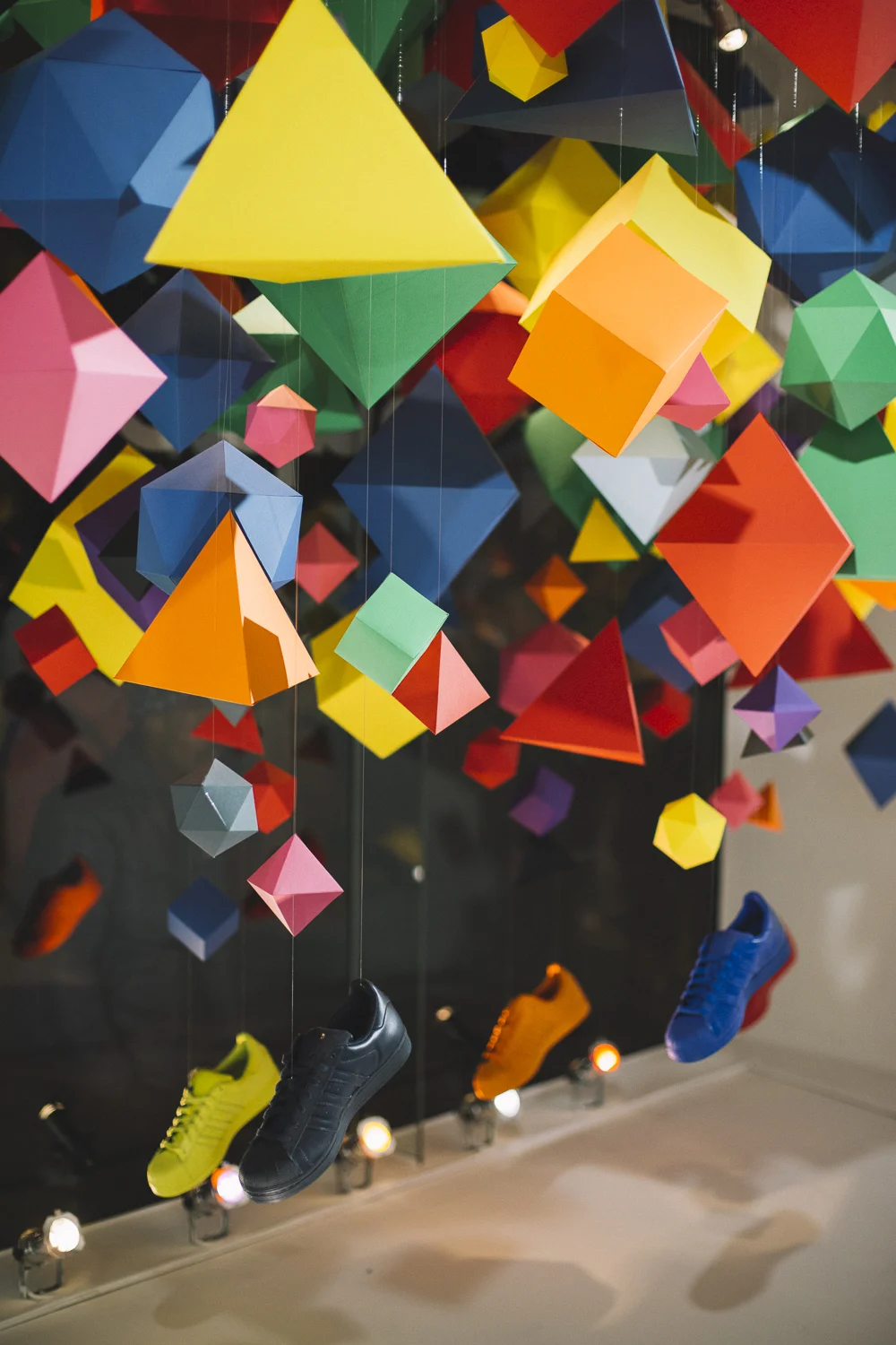 As this was the first public reveal of AREA3's bold new window display, the ANDPEOPLE team and I worked to conceptualise the perfect display for this important launch. Origami artist, White On Rice, was brought on board to make up hundreds of paper-craft shapes in the colours of the new Supercolor range. Spending a few days up a ladder in the window, I hung these from the ceiling along with the hero-ed sneakers to create a large, eye-catching installation that could be enjoyed from the street, as well as from inside the store.